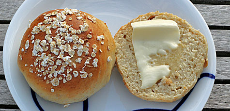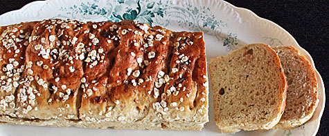 Når æblerne har ligget i blød i fem minutter sies vandet fra og bruges til smør, olie og honning blandingen. Vand, smør, olie og honning varmes op til ca. 30 grader i mikro ovnen. Gæren røres ud i væsken. Havregryn, salt og mel vejes op i en skål. Æblerne tilsættes. Hæld det smeltede/bløde smør honning blanding i skålen og rør rundt. Æggene tilsættes imens der røres. Ælt dejen godt sammen, den skal samle sig og blive en fast dej, skal røres længe. Lad dejen hæve til dobbelt størrelse under et fugtigt viskestykke. Ca. 1 til 1½ time. Del dejen i to/tre stykker. Form dem til brød og kom i brødform. Dejen kan også formes til boller bagetiden bliver så ca. 20 min. Lad dejen efterhæve 1 time, sæt ovnen på 190 grader – og pensle med æggehvide og drys havregryn på. Bag brødene ca. 28 – 30 minutter. Brødet skal afkøles for ikke krumme for meget før du skærer det.