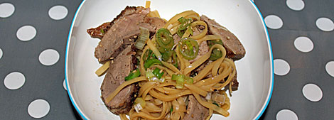 Forvarm ovnen til 180C. Med en skarp kniv, skæres fedtsiden af and i tern. Drys de 5. krydderi pulver på andefedtet og gnid det ind i fedtsiden. Krydr med salt og friskkværnet sortpeber. Varm en tykbundet ovnfast stegepande. Må ikke tilsættes olie. Placer andebryst fedsiden nedad i den varme gryde. Krydr kødsiden med 5. krydderier og salt og friskkværnet sort peber. Steg indtil det meste af fedtet er løbet ud i gryden og fedtet har en gylden farve (ca. tre minutter). Vend andebrystet over og steg den anden side i et minut. Sæt andebrystet i ovnen i 3-8 minutter til mørt. Tryg på det og mærk at det skal være fast. Til saucen, varm honning og soya sammen i en lille gryde. Bring op til kogepunktet og lad det boble i et minut eller to for at reducere. Tag af varmen og lad den afkøle. Saucen skal have en sirup-agtig konsistens. Tag de stegte andebryster ud af ovnen og lad den hvile et varmt sted. Imens anden hviler, varm en mellemstor gryde med saltet vand. I mellemtiden snittes forårsløget i 1 cm stykker. Når vandet koger, tilsæt ægnudler og kog efter instruktionerne. Hæld vandet fra nudlerne og placere dem i en skål. Kom sesamolie på panden varm op kom næsten alle forårsløg i panden og varm igennem, drys med sesamfrø. Kom forårsløg, sesamfrø og olie blandingen over nudlerne og bland sammen med de fint skårne andebryster. Pres en smule lime juice over. Drys de resterende forårsløg over og dryp med honning og sojasauce. Sovsen skal over samtidigt med man smager til og passer på det ikke bliver for salt.
