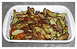 Asparges kartoflerne halveres på langs. Gulerødderne skæres i skiver. Baconskiverne skæres i små stykker. Det hele blandes og krydres med salt og peber. Husk at baconet er salt. Drysset med krydderurter. Bages ca. 45 min ved 200 g. afhængigt af portion og ovn.