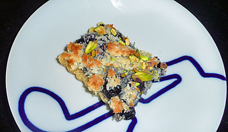 Rør kokos, sukker og æggehvider sammen. Fordel blåbær jævnt over tærtebunden. Ved hjælp af en lille ske, sættes lidt totter af makronfyld omkring bærene, sørg for de er delvist dækket. Bag i 20 til 25 min. indtil toppene af makron er gyldne. Lad tærten afkøle, pynt med de knuste pistacienødder (jeg trykkede dem en lille smule ned,så de bliver der) skæres ud i små firkanter.
