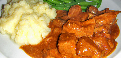 Skær løgene i tern og svits dem i en stor gryde. Afrens nakkefilleten for det væreste fedt og skær den ud i store tern og brun dem godt i gryden. Skær svinemørbraden i tern og tilsæt. Champignons renses og skæres i tern. De tilsættes sammen med fløde, vand, salt, peber og boulion. Lad retten simre i et par timer, til kødet er helt mørt. Tilsidst kan sovsen jævnes med lidt majsstivelse, hvis man ønsker det og kulør kan give en flot brun farve.