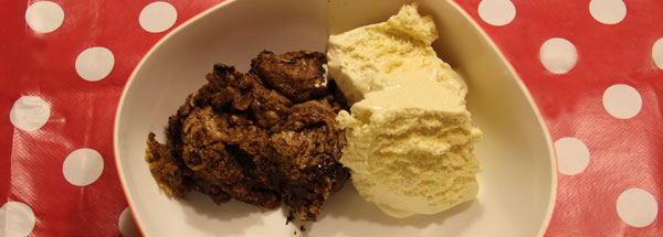 Vend chokoladestykkerne i. Anbringes i ovnen i 15-20 (20-30 min.) minutter, eller indtil den begynder at blive gylden på toppen og omkring kanterne, men blød i midten. Serveres med vanilleis.