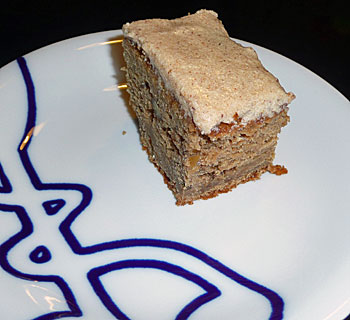 Forvarm ovnen til 180 ° C. Smør en 20 x20 cm (eller tilsvarende.) firkantet bradepande. Eller brug bagepapir. Rør mel, bagepulver, natron, salt og krydderier sammen. Pisk smør, brun farin og vanille med en elmixer med høj hastighed, indtil det er blegt og fluffy, 2 til 3 minutter. Tilføj æg, et ad gangen, rør godt efter hvert æg. Rør æblemosen i. Ved lav hastighed, blandes mel i blandingen, indtil dejen samler sig, så røres valnødderne i. Dejen vil se lidt ujævn ud, men fortvivl ikke, vil bage op perfekt i sidste ende. Fordel dejen jævnt i panden og bag til den er gyldenbrun og en strikkepind i midten kommer ren op igen, omkring 35 til 40 minutter. Køl af i 15 minutter. Kør en kniv rundt kanten af kagen for at løsne, så vendes den ud på en tallerken. Vend kagen tilbage med toppen opad på en rist til at afkøle helt. Kan fremskyndes i køleskabet. Topping: Rør flødeost, smør og vanille med en elmixer med høj hastighed, indtil blød og cremet. Sigt flormelis og kanel over flødeost blandingen, rør langsomt indtil helt blandet. Fordel blandingen over toppen af den afkølede kage. Kagen med topping på holder sig fint i køleskabet i flere dage.