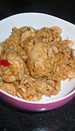 Læg igen kyllinge stykkerne på panden og hæld fonden ved. Lad det simre i 20-25 minutter, indtil kyllingen er mør. Tilsæt risene, dæk med låg og lagt sæt i den forvarmede ovn. Bag i 30 minutter, eller indtil al væsken er absorberet og risene er kogt. Alternativt, hvis du bruger en pande, som ikke passer ind i ovnen, dæk tæt med folie og fortsætte tilberedningen på komfuret over en svag varme i samme tilberedningstid. Rejerne tilsættes i de sidste 5 min. Retten smages til med salt og peber.