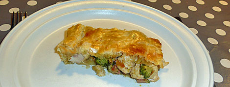 Rul butterdejen ud til to plader, der er lidt større end tærteformen. Smør tærteformen med lidt olie og beklæd den med den ene plade. Skær kyllingefiletterne i strimler, brun dem af på en pande med bacon. Krydr kylling bacon med den ønskede smags giver, eventuelt smagssæt med en anelse soyasovs som lige skal koges ind. Læg indholdet fra panden med løg og broccoli i en form. Krydr med salt og peber. Drys ost over og læg den sidste butterdejsplade på som låg. Pres kanten sammen og pensl tærten med sammenpisket æg.