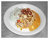 Tænd ovnen på 200 grader. Skær kødet i fingertykke strimler, og vend dem i salt og peber. Brun dem i olien, og lad dem svitse efter tykkelse (de skal være gennemstegte, men ikke tørre). Krydr med paprikaen. Skær peberfrugten i tynde strimler og læg den sammen med kødet i et ovnfastfad (Smør kanterne let). Pisk fløden til skum, og smag til med chilisauce. Skummet må gerne blive lyserødt. Kom det overpå kødet. Sæt retten i ovnen ved 225 grader, til overfladen er gylden, ca. 20 min. Steg imens baconet sprødt. Server Kyllingeret med peanuts med bacon og peanuts drysset over.