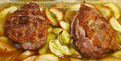 Fjern rester af sener og urenheder med en kniv. Snit fedtet i tern, så snittene går igennem ned til kødet og gnid oversiden med salt og presset hvidløg. Pil løget og snit det i både. Æblerne skylles og skæres i både, hvorefter kernehuset fjernes. Bland løg og æbler og læg dem i et ildfast fad, som passer i størrelsen til lammeculotterne. Hæld bouillonen over og læg culotterne over. Sæt dem i ovnen ved 175 grader i ca. 30 minutter.