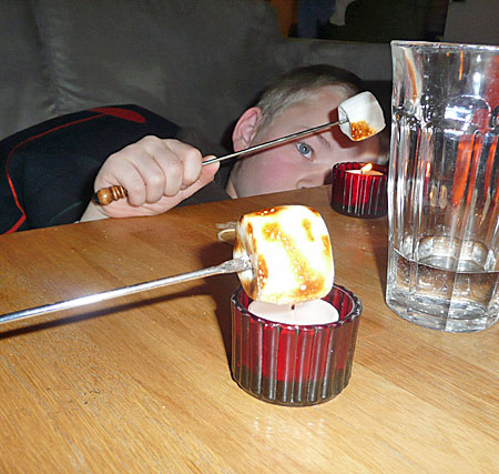 Varm skumfiduserne op ved et bål eller starinlys indtil de er flydende indvendigt. Læg den imellem to mariekiks og spis.