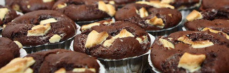 Mel, bagepulver, natron, salt, vanilje, kakao og chokolade blandes godt sammen i en skål. Æg, sukker og smør piskes luftigt, og yoghurten røres i. Dette hældes melblandingen, og røres sammen evt med en dejskraber. Kun lige til hele melblandingen er våd. Dette fordeles som det sidste lag på de 36 muffins, og der drysses med den ekstra hvide chokolade ud over dine muffins. Jeg bager selv i en aluform med papirforme i, hvor der kan være 12. Almindelig varme, 200 grader i 16-17 minutter afhængig af hvor klæg du gerne vil have din browniebund. En plade ad gangen.
